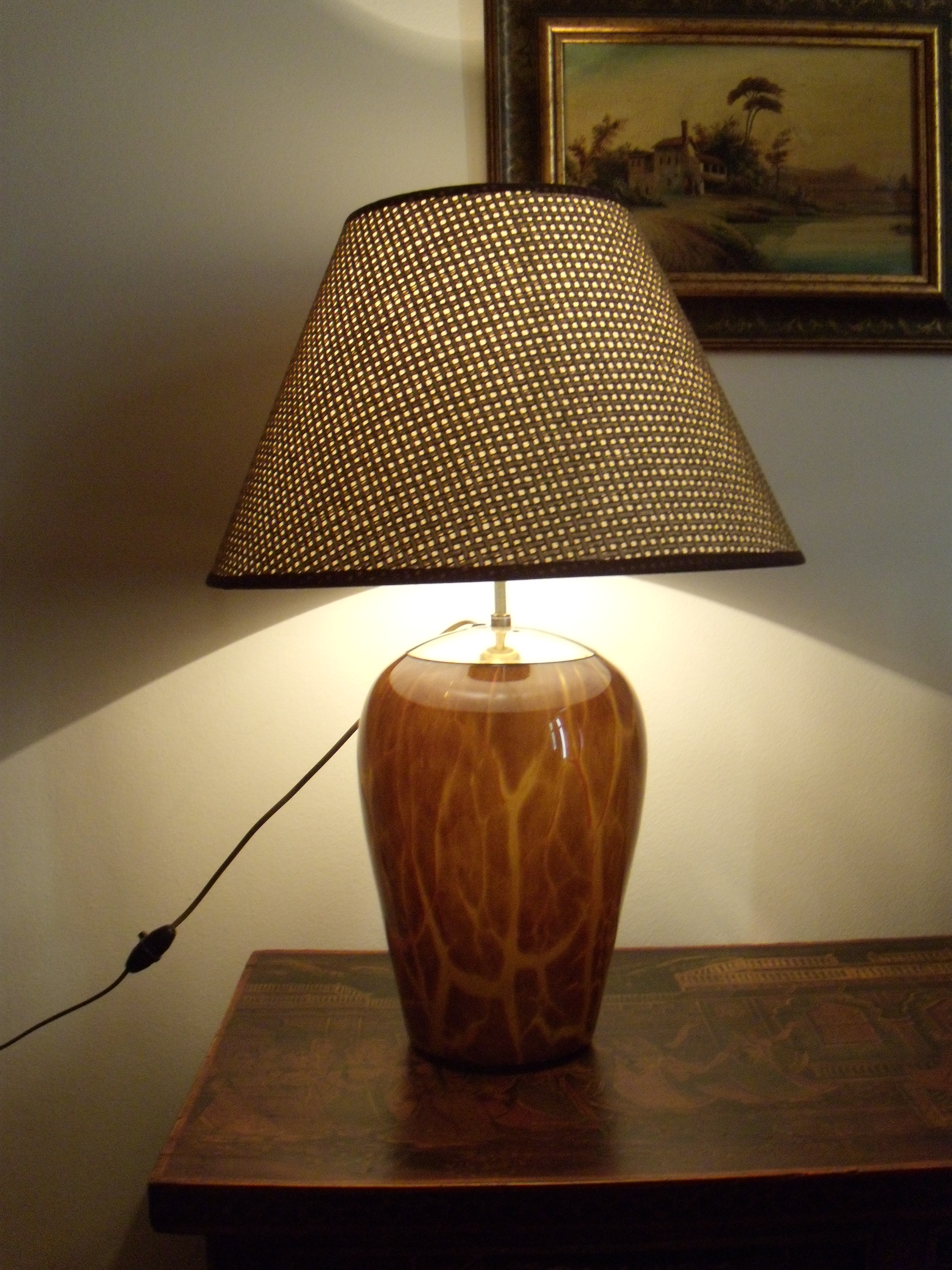 Большая настольная лампа — высота 60 см с абажуром, диаметр абажура 42 см. Стекло, латунь, абажур рогожка. Винтаж из 80-х. Дает очень эффектный свет. Будет прекрасно смотреться в этническом или псевдоколониальном интерьере.