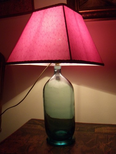 Лампа на основании из старинной тяжелой бутыли ручного выдува. Современный розовый абажур в форме усеченной пирамиды. На мой взгляд, очень интересное сочетание. Освещенное сверху толстое зеленоватое стекло смотрится волшебно.