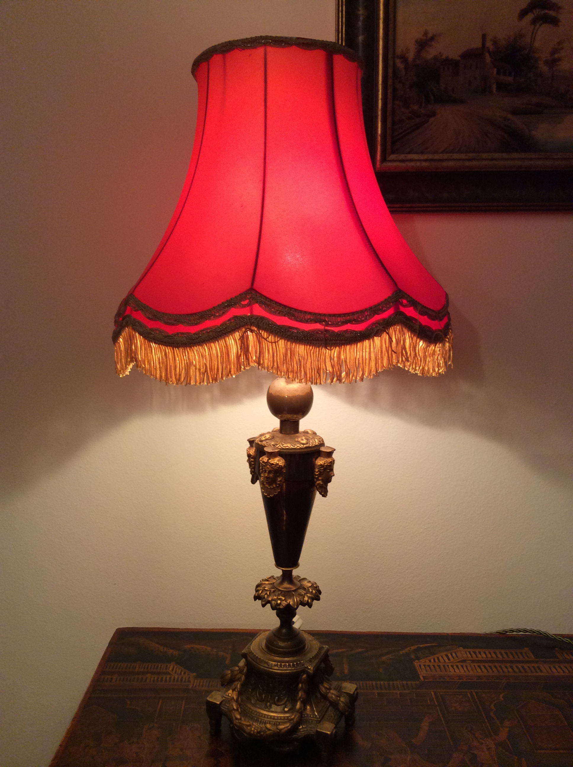 Германия, 50-60 гг. Латунь, ручная роспись на молочном стекле, шелковая бахрома. Высота 35 см.